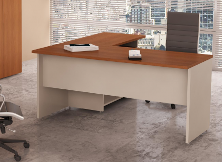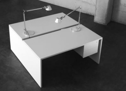 Escritorios modernos construidos en melamina Faplac de 25mm de espesor con terminación de canto perimetral en ABS de 2mm.