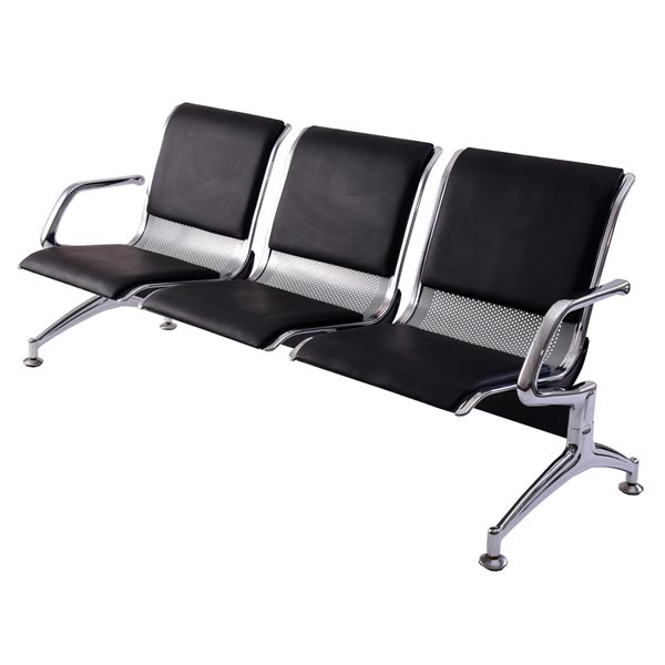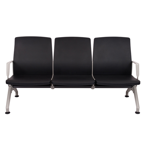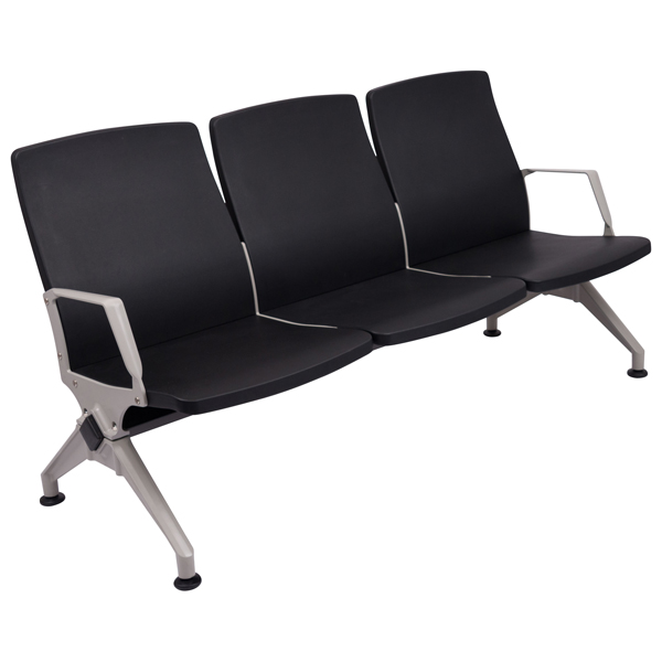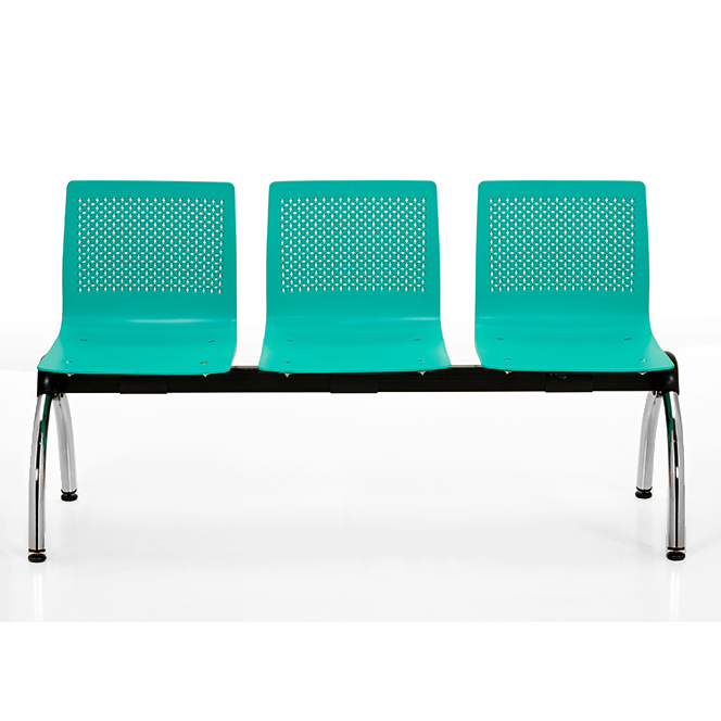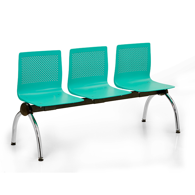 Opcionales: Módulos de 3 y 4 puestos de asientos y mesas combinables. Plásticos en color Amarillo, azul, blanco, gris claro, negro, rojo y verde. Estructura curva negra o cromada.
