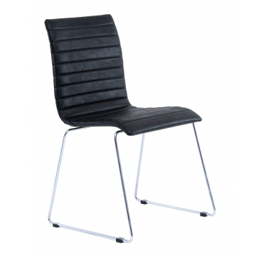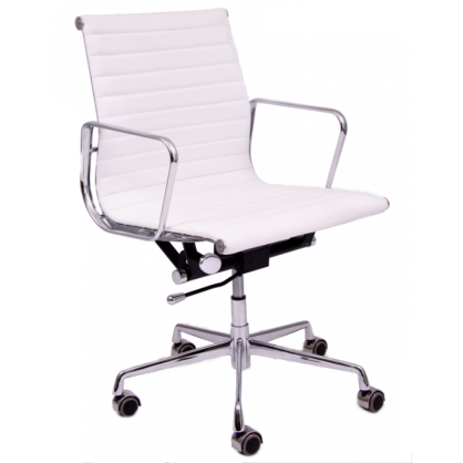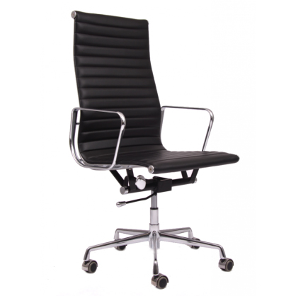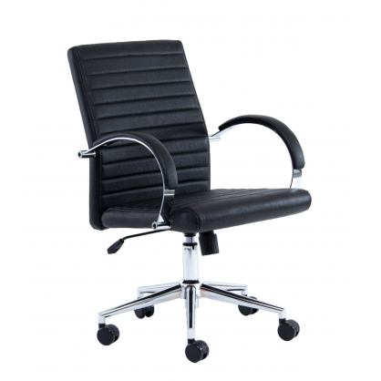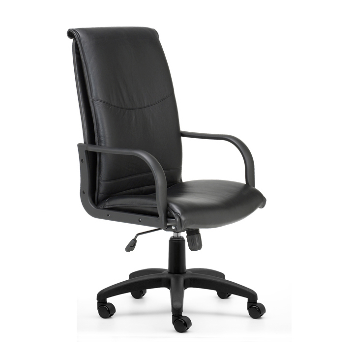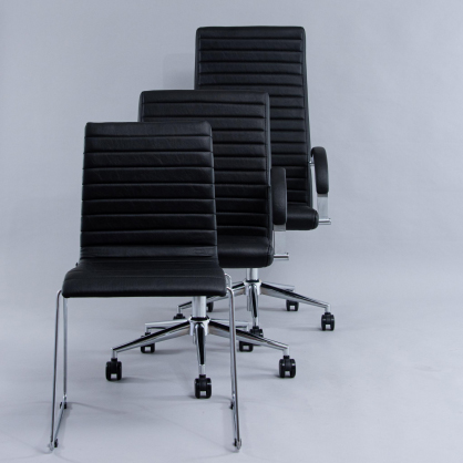 Tapizado en Milenium Negro, un cuero ecológico de calidad, agrega un toque de suscitación. La base de 5 ruedas, disponible en versión cromada o de nylon negro, proporciona estabilidad y movilidad suave. Las ruedas de banda de goma de 60mm aseguran un desplazamiento silencioso y sin rayar la supercie.
